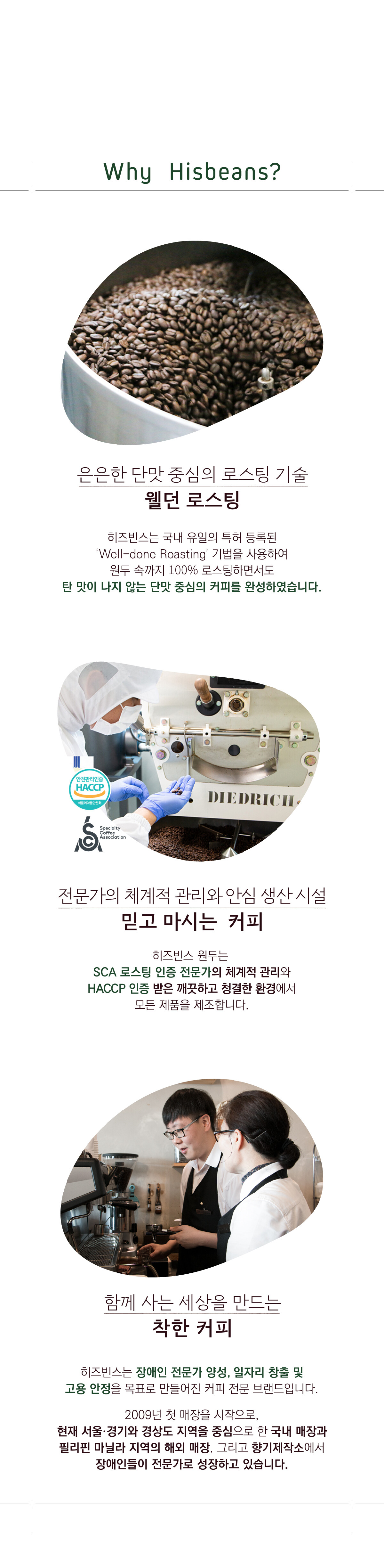 히즈빈스는 분쇄전 원두인 홀빈을 비롯, 5단계의 분쇄옵션을 제공해 드리고 있습니다.
