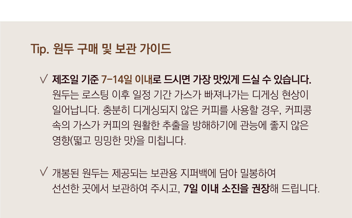 원두 제품의 경우 주문 확인 후 로스팅하기 때문에 2-4일 후 출고될 수 있습니다. 이점 유의하시고 여유있게 주문 부탁드립니다.
