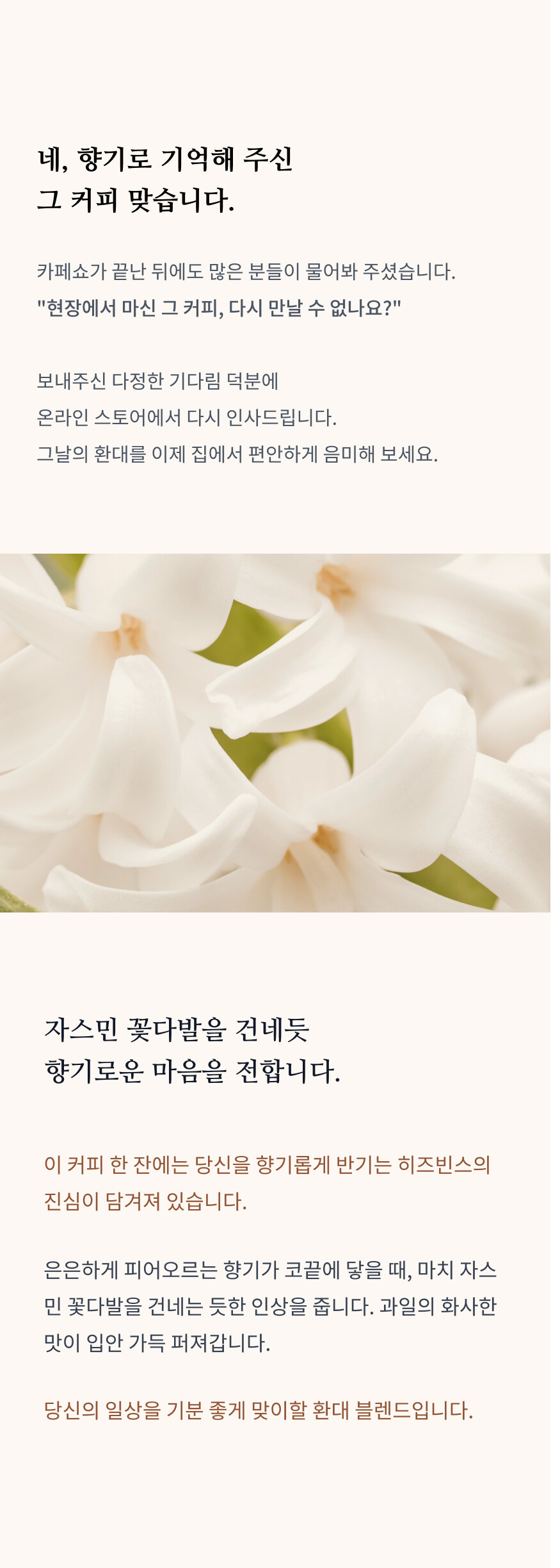 마치 자스민 꽃다발을 건네는 듯한, 환대를 표하는 화사하고 향기로운 마음. 당신의 하루를 기분 좋게 맞이하는 커피입니다. 게이샤 특유의 화사한 꽃향기와 부드러운 산미가 특징인 스페셜티 커피입니다.