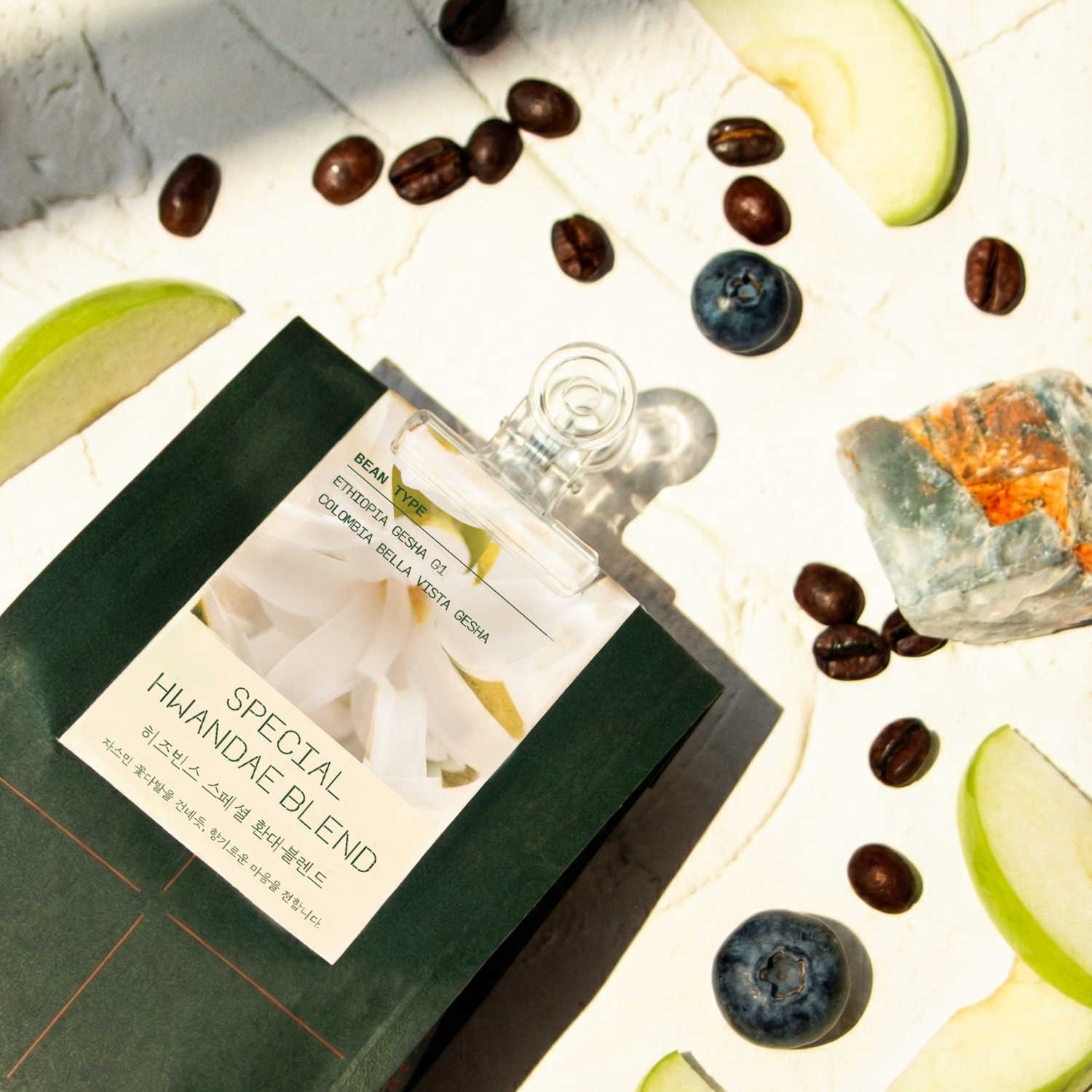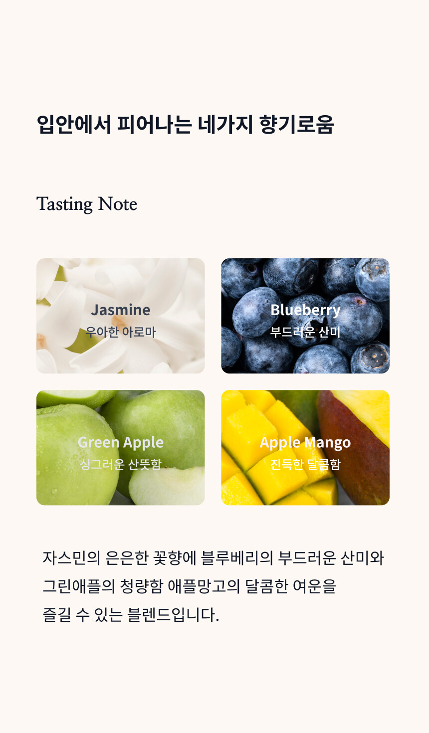 자스민의 은은한 꽃향에, 블루베리의 부드러운 산미와 그린애플의 청량함, 애플망고의 달콤한 여운을 즐길 수 있는 블렌드입니다.