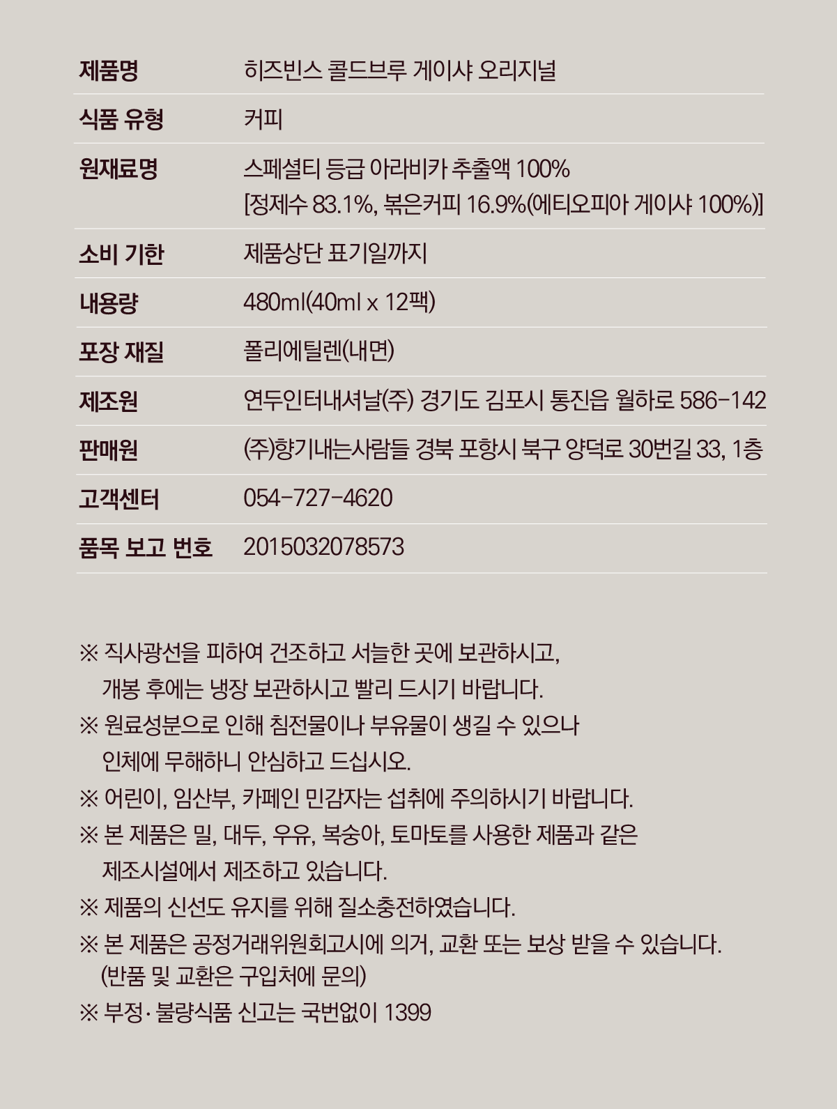 •원재료명: 스페셜티 등급 아라비카 추출액 100% [고형분 4% 이상, 정제수, 볶은 커피 17.1% (에티오피아 게이샤 G1 50%, G2 50%)]
